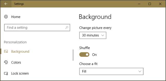 Vă puteți personaliza fundalul făcând clic pe „Fundal”. Majoritatea temelor oferă mai multe imagini de fundal și configurează o prezentare de diapozitive. Puteți controla frecvența cu care se modifică fundalul desktopului sau setați prezentarea la „Shuffle”, astfel încât să aleagă o imagine aleatorie din prezentarea de diapozitive de fiecare dată când se schimbă.