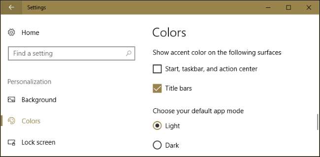 Dacă doriți ca culoarea accentului temei dvs. să fie utilizată pentru barele de titlu ale ferestrei, va trebui să derulați în jos pe ecranul Color și să activați opțiunea „bare de titlu” din „Afișați culoarea accentului pe următoarele suprafețe”. În caz contrar, Windows 10 va folosi bare de titlu albe implicite.