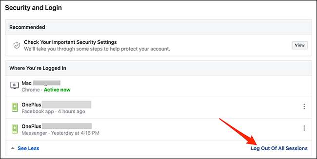 Veți vedea o listă de dispozitive în care utilizați contul dvs. Facebook. Pentru a ieși din toate aceste dispozitive, faceți clic pe "Deconectați-vă din toate sesiunile" în colțul din dreapta jos al secțiunii "Unde vă conectați".