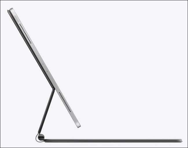 Tastatura Magic este confortabilă pentru a introduce și utilizează un design articulat care vă permite să reglați unghiul de vizualizare. Se află puțin mai mare decât ecranul mediu al laptopului și se pliază plat pentru a vă proteja tableta în tranzit. De asemenea, aveți un port USB-C plasat convenabil pentru expansiune sau încărcare.