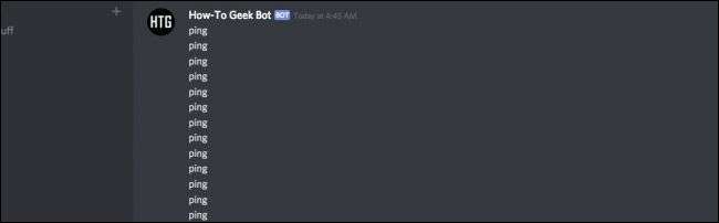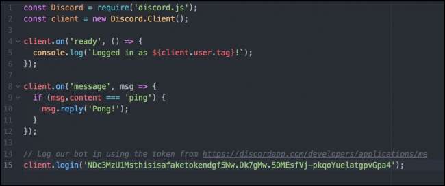 client.on („mesaj”)blocul se va declanșa de fiecare dată când un nou mesaj este postat pe orice canal. Desigur, va trebui să verificați conținutul mesajului și asta este ceea cedacăblocul face. Dacă mesajul spune doar „ping”, atunci acesta va răspunde cu „Pong!” - Ultima linie se conectează cu simbolul de pe portalul bot. Evident, simbolul din captura de ecran aici este fals. Nu postați tokenul pe internet.