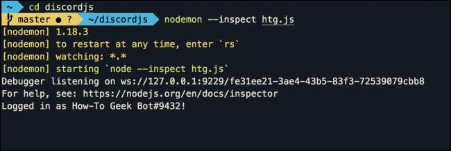 Acum, ar trebui să spună „Conectat ca <nume-bot>”, dar aici am adăugat o linie care va înregistra toate obiectele mesaj primite în consolă:
