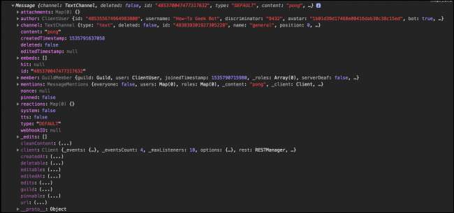 În special, aveți informațiile despre autor și informațiile despre canal, pe care le puteți accesa cu msg.author și msg.channel. Recomand această metodă de înregistrare a obiectelor în devtools Chrome Node și doar căutarea în jur pentru a vedea ce face să funcționeze. S-ar putea să găsiți ceva interesant. Aici, de exemplu, botul își înregistrează răspunsurile la consolă, astfel încât răspunsurile botului să se declanșeze