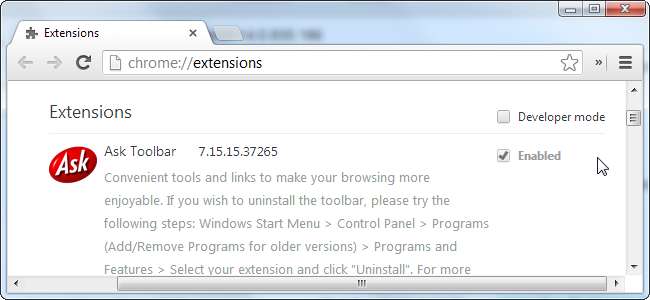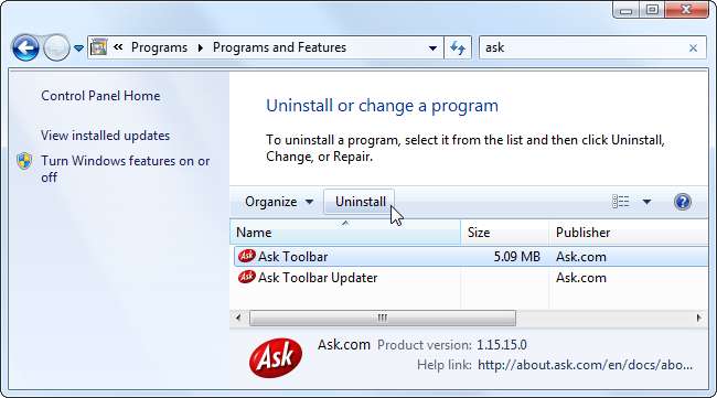 Din fericire, putem dezinstala doar Bara de instrumente Ask din panoul de control, deci acest lucru nu contează cu adevărat în acest exemplu. Cu toate acestea, Ask.com a oferit un exemplu excelent autorilor de programe malware care doresc să evite protecția Chrome împotriva extensiilor instalate la nivel global.