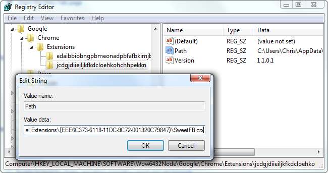 Fiecare cheie (folder) de sub cheia Extensii reprezintă o extensie Chrome instalată la nivel global. Puteți verifica ce extensie conține o cheie deschizând cheia și examinând valoarea Căii.