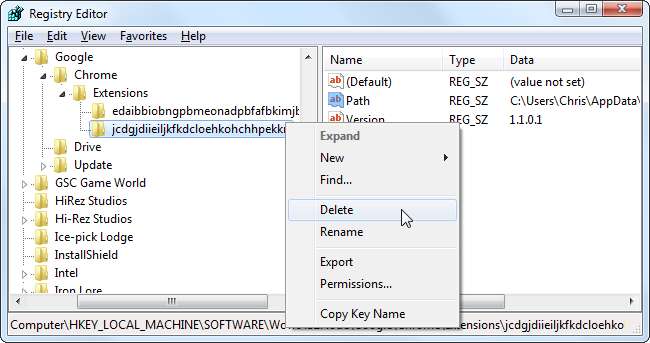 Pentru a scăpa de această extensie, va trebui să-i ștergem cheia făcând clic dreapta pe ea și selectând șterge.