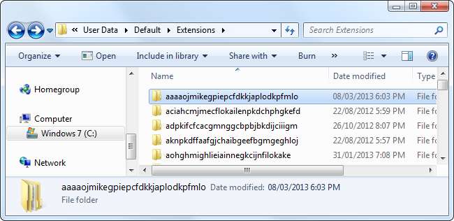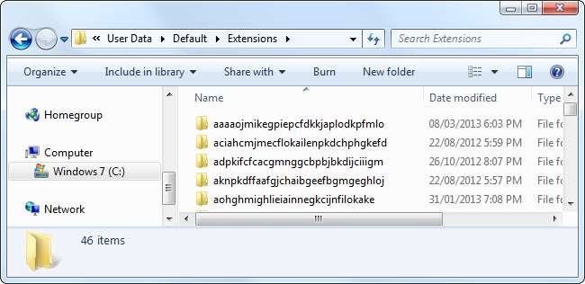 Deschideți folderul de profil - denumit în mod implicit, cu excepția cazului în care ați creat un profil nou - și deschideți folderul Extensii din interiorul acestuia. Ar trebui să vă aflați într-un dosar precum următorul:
