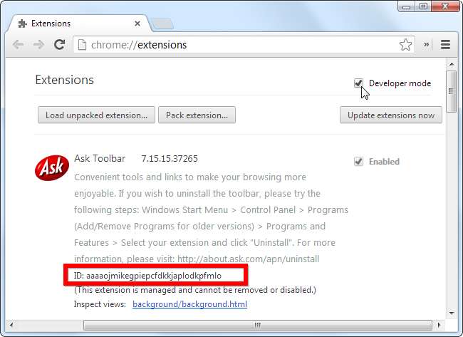 Dacă aveți instalate o varietate de extensii și aplicații, veți vedea destul de multe subfoldere. Pentru a determina care dintre acestea este asociată cu Bara de instrumente Ask (sau orice extensie instalată la nivel global pe care doriți să o eliminați), putem deschide pagina Extensii Chrome, putem activa caseta de selectare Mod dezvoltator și putem vizualiza ID-ul extensiei Ask Toolbar.