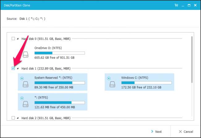 Mai întâi, selectați discul sursă. Aceasta va fi unitatea dvs. de sistem Windows curentă. Unitatea noastră de sistem este formată din trei partiții: o partiție de pornire activă, partiția Windows reală și o partiție de recuperare. Vrem să clonăm toate cele trei, așa că vom pune doar o bifă lângă hard disk pentru a ne asigura că sunt toate selectate. Faceți clic pe „Următorul” pentru a continua.