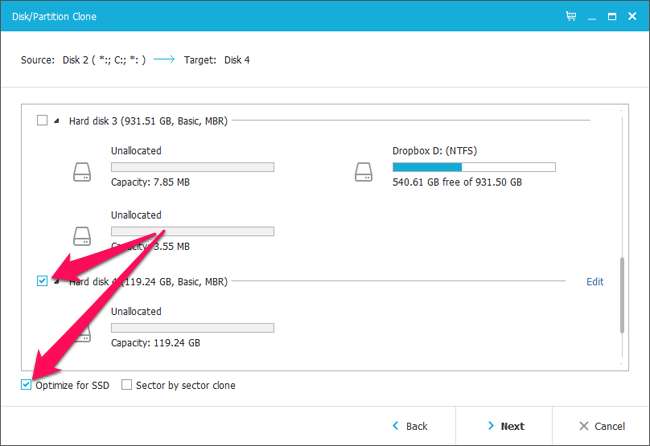 Acum trebuie să vă selectați SSD-ul ca destinație. În cazul nostru, acesta este „Hard Disk 4”, care conține 119 GB de spațiu nealocat. Face absolut sigur alegeți unitatea corectă sau puteți pierde date!