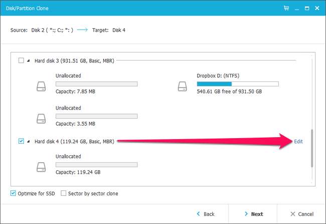 Acum, înainte de a face clic pe „Următorul”, faceți un minut pentru a face clic pe butonul „Editați” de lângă SSD.