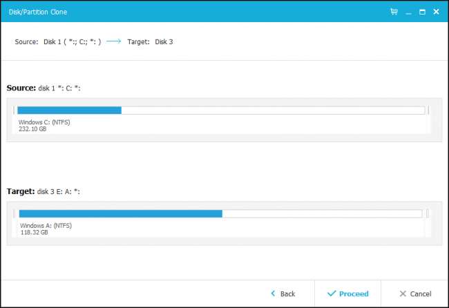 În funcție de aspectul unității dvs., poate fi necesar să modificați lucrurile într-un mod diferit. Când ați terminat, faceți clic pe „OK” pentru a continua. Verificați dacă totul arată corect și faceți clic pe „Continuați” pentru a începe operația de clonare.