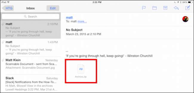 Așa cum ar presupune această metodă, dacă doriți să vizualizați fișiere zip fără să vizitați niciodată App Store, va trebui să vă trimiteți prin e-mail arhive și apoi să le deschideți cu Mail. Acest lucru este puțin practic, motiv pentru care vă recomandăm să încercați o aplicație tradițională de gestionare a zip-ului, cum ar fi WinZip sau iZip.