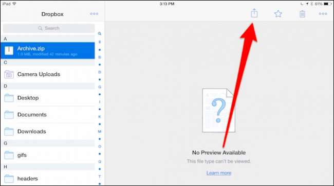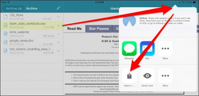 Vizualizarea fișierelor zip în Mesaje sau e-mail este, totuși, doar asta, vizionarea. Dacă doriți să extrageți un fișier și să îl editați, veți avea nevoie de o aplicație de ajutor adecvată. Puteți atinge butonul „Distribuiți” și puteți alege aplicația pe care doriți să o utilizați.