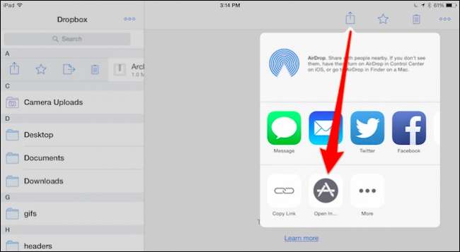 Dacă dorim să deschidem un fișier, trebuie să atingem din nou pictograma „Partajare” și apoi să alegem aplicația corespunzătoare din meniul „Deschideți în ...”.