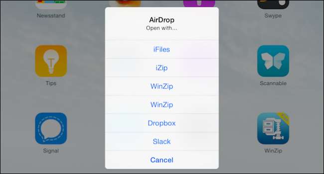 Folosind fie versiunea gratuită, fie cea cu plată a unei aplicații zip, vă va permite, de asemenea, să abordați direct arhivele de deschidere prin AirDrop. De exemplu, când AirDrop arhivează de pe computerul Mac, veți vedea o listă de opțiuni pentru modul în care o puteți gestiona.