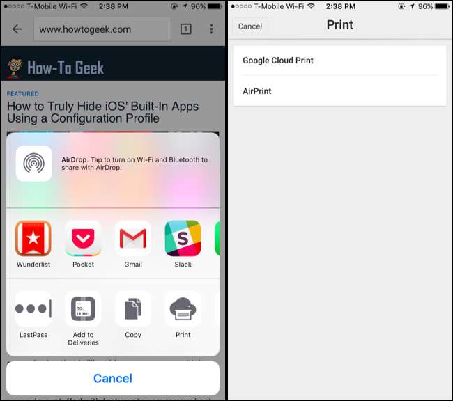 A lui Apple Imprimare AirPrint este profund integrat în iPhone și iPad. Opțiunile „Print” (Imprimare) pe care le vedeți în întregul sistem de operare se vor imprima numai pe imprimante compatibile AirPrint. Puteți imprima în continuare pe o imprimantă compatibilă cu Google Cloud Print, dar va fi nevoie de un efort suplimentar.