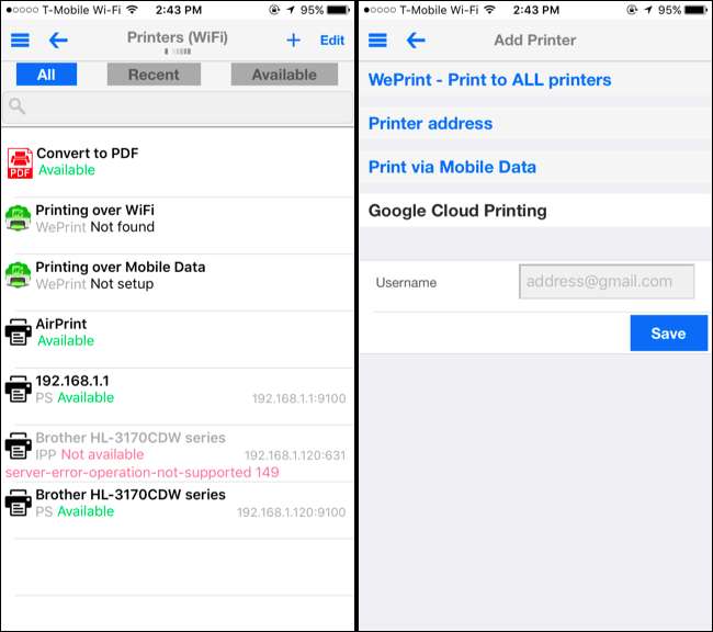 Această aplicație completează piesele lipsă cu Google Cloud Print - și alte tipuri de imprimante - pe iOS. După ce ați instalat-o, puteți deschide aplicația și puteți vedea o listă a imprimantelor din apropiere. PrintCentral Pro acceptă o varietate de alte imprimante, inclusiv majoritatea imprimantelor Wi-Fi. Atingeți butonul „+” de pe ecran cu listarea imprimantelor disponibile, selectați „Google Cloud Printing” și conectați-vă cu contul dvs. Google pentru a avea acces la toate imprimantele Google Cloud Print pe care le aveți.
