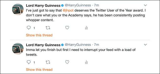 Urmăritorii dvs. vor vedea primul Tweet din thread (și poate încă încă două). Pentru a vedea totul, trebuie să facă clic pe linkul „Afișează acest fir”.