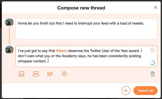 Acum aveți o a doua fereastră de Tweet pe care să o utilizați, așa că introduceți ceea ce doriți să spuneți, apoi faceți clic din nou pe butonul plus dacă aveți nevoie de mai multe tweets.