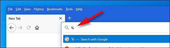 Pentru a intra în modul de căutare a tab-ului cu un caracter de comenzi rapide, focalizați bara de adrese, tastați% (un simbol procentual) și apăsați spațiu o dată.