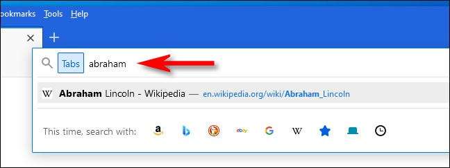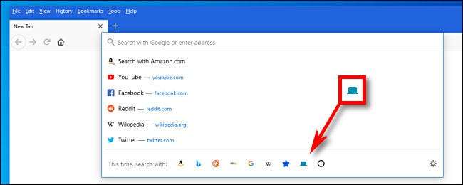 Pentru a intra în modul de căutare cu mouse-ul, faceți clic o dată pe bara de adrese Firefox. În partea de jos a meniului care apare, căutați secțiunea "Acest timp, căutare cu" și faceți clic pe pictograma fila (care arată ca o filă sau un buton albastru-verde).
