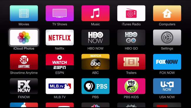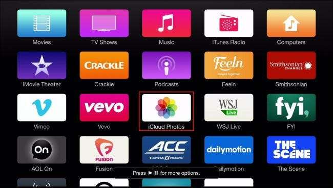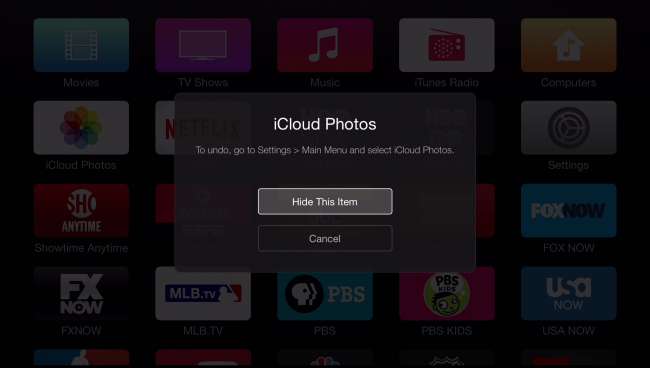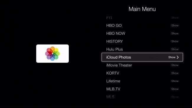 În mod normal, țiglă „Fotografii iCloud” este ascunsă, astfel încât atunci când o afișați, va apărea probabil în meniul principal. Puteți să o lăsați acolo sau, dacă o selectați, ținând apăsat butonul mare de pe telecomanda Apple TV, faianța va începe să tremure, ceea ce înseamnă că acum o puteți muta într-o altă parte a meniului principal (folosind tastele de direcție ale telecomenzii) .