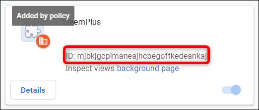 Derulați în jos până găsiți extensia adăugată de politică - căutați-o pe cea pe care nu o puteți elimina în mod normal din pagina Extensii. Evidențiați ID-ul extensiei și apăsați Ctrl + C pentru ao copia în clipboard.