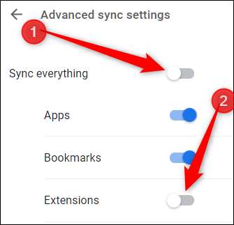 Pe ecranul următor, tot ce este salvat în contul dvs. și sincronizat pe toate dispozitivele dvs. este listat mai jos. În mod implicit, „Sincronizează totul” este activat. Pentru a comuta manual ce informații să sincronizați cu Chrome, trebuie mai întâi să dezactivați „Sincronizați totul”, apoi să dezactivați „Extensii” comutând comutatorul de pe acesta.