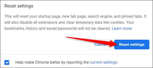 Se va afișa un mesaj care vă va avertiza asupra repercusiunilor resetării browserului. Aceasta va reseta pagina de pornire, pagina de filă nouă, motorul de căutare, filele fixate, extensiile instalate și cookie-urile. Nu va șterge marcajele, istoricul browserului sau parolele salvate. Faceți clic pe „Resetați setările” când sunteți gata să continuați.
