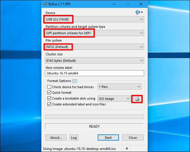 În schimb, veți dori să porniți Chromebookul într-un mediu Linux. Vom folosi Ubuntu ca exemplu, dar și alte distribuții Linux ar trebui să funcționeze bine. Descarca un ISO Ubuntu și utilitarul Rufus . Lansați Rufus, selectați o unitate USB și alegeți „Schema de partiție GPT pentru UEFI”, precum și „FAT32”. Faceți clic pe butonul din dreapta „Creați un disc bootabil folosind” și selectați Ubuntu ISO descărcat. Faceți clic pe „Start” când sunteți gata.