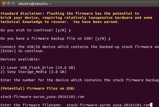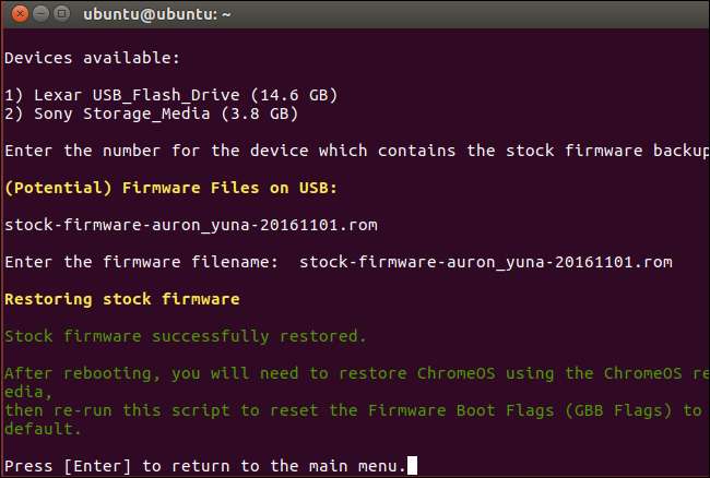 Răspundeți la întrebările scriptului, conectând unitatea USB care conține fișierul de rezervă BIOS și îndreptați scriptul către acesta. Scriptul va afișa BIOS-ul de rezervă pe Chromebook.