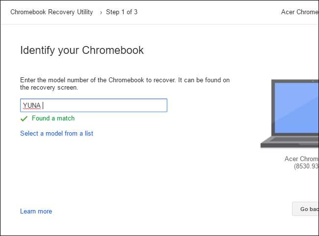 Găsiți-vă modelul Chromebook în aplicația Chromebook Recovery Utility. O puteți alege din listă sau pur și simplu introduceți numele de cod.
