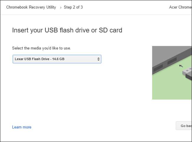 Accesați expertul Chromebook Recovery Utility. Aplicația va șterge unitatea USB atașată și va plasa suportul de recuperare Chrome OS pe ea. Dacă Chromebookul dvs. are un slot pentru card SD, puteți utiliza și acest utilitar pentru a plasa suportul de recuperare pe un card SD.
