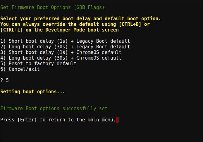 Spuneți scriptului pe care doriți să-l „Resetați la setările implicite din fabrică” tastând „5” și apăsând Enter.