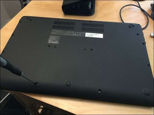 Fă același lucru pe care l-ai făcut când ai scos șurubul. Mai întâi, închideți Chromebookul - nu doar puneți-l în repaus, ci închideți-l complet. Întoarceți Chromebookul și deșurubați partea de jos.