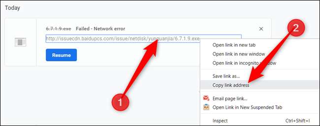 Deschideți managerul de descărcări cu Ctrl + J (Windows) sau Command + J (macOS), găsiți fișierul, faceți clic dreapta pe site-ul web al fișierului sursă, apoi selectați „Copiați adresa linkului”.