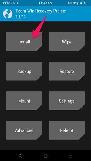 După ce ați făcut acest lucru, veți fi întâmpinați cu ecranul de pornire familiar TWRP. Faceți clic pe butonul Instalare.