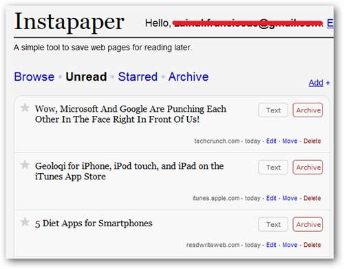 Salvați câte linkuri doriți și, când sunteți gata să le citiți, accesați site-ul Instapaper și veți vedea o listă a articolelor salvate. Puteți face clic pe fiecare link pentru a accesa direct pagina salvată sau arhivați articolul pentru mai târziu.