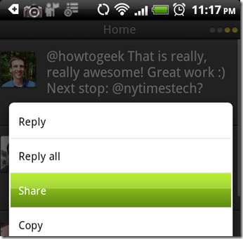 Salvarea tweet-urilor pentru citirea ulterioară în clientul Android al TweetDeck este o briză. Atingeți și țineți apăsat un Tweet pentru a afișa meniul de partajare.