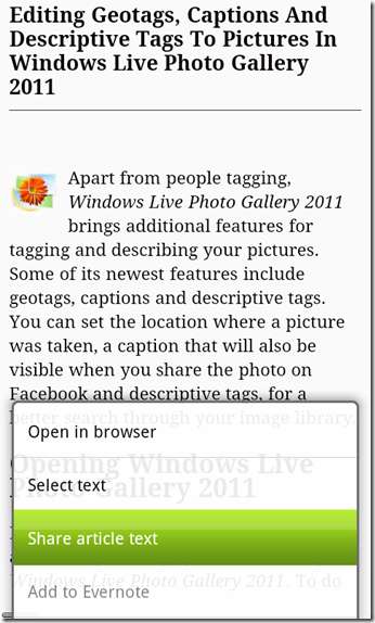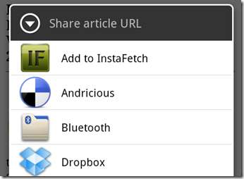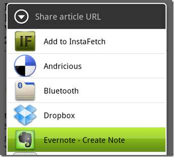 Vă recomandăm să instalați clientul Evernote pentru Android, astfel încât să puteți trimite linkuri direct la Evernote de la Instafetch. Există două opțiuni pentru a salva conținutul Instapaper în Evernote: salvarea adresei URL sau salvarea conținutului paginii web în Evernote. Dacă doriți să salvați adresa URL, trebuie să atingeți butonul de partajare, urmat de meniul „Evernote - Creați o notă”.