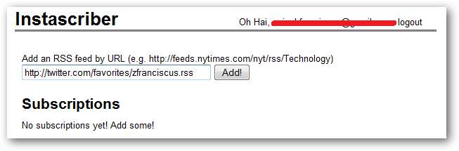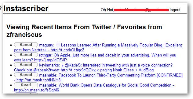 În loc să salvați fiecare link către Instapaper, ar fi bine să le setați să facă acest lucru automat, iar aici intră Instascriber. Instascriber vă citește fluxul „Tweets preferate” și îl trimiteți la Instapaper când faceți clic pe „Salvat” buton.