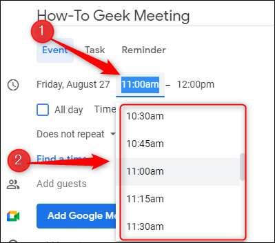 Acum alegeți timpul de început și sfârșitul întâlnirii. Prima dată este ora de începere a întâlnirii, iar a doua oară este când se încheie întâlnirea. Faceți clic pe ora afișată în prezent și va apărea un meniu derulant. Selectați ora dorită din meniu.