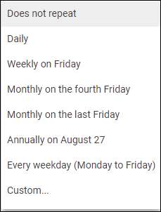 Va apărea o listă de opțiuni. Opțiunile afișate depind de data stabilită a întâlnirii. Alegeți opțiunea dorită din listă. Dacă nu vedeți unul care funcționează pentru dvs., puteți alege "personalizat" pentru a vă crea propriul calendar pe care întâlnirea recurgeau.