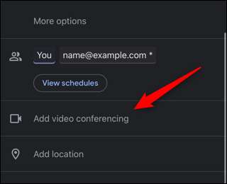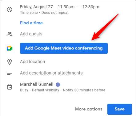 Apoi, apăsați "Adăugați videoconferințe". Aceasta va atribui automat o adresă URL de întâlnire Google la evenimentul dvs.
