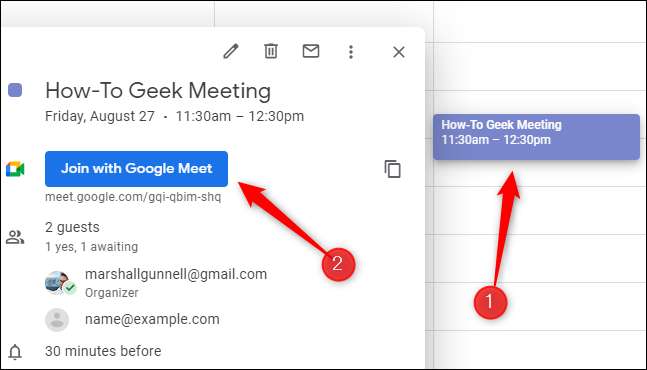 Ați programat acum întâlnirea de întâlnire Google. Când este timpul să Alăturați-vă întâlnirii , faceți clic pe eveniment din Calendarul Google și apoi faceți clic pe butonul Blue "Alăturați-vă cu Google Letting".