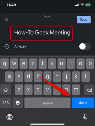 Pagina de opțiuni de eveniment va apărea. Atingeți caseta de text "Adăugați titlul" și dați evenimentului un nume. Atingeți "făcut" când ați terminat.