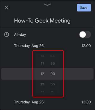 După ce selectați data, opțiunea de reglare a timpului va apărea automat. Derulați numerele în sus și în jos pentru a selecta ora. Repetați acești pași pentru data și ora de încheiere, de asemenea.