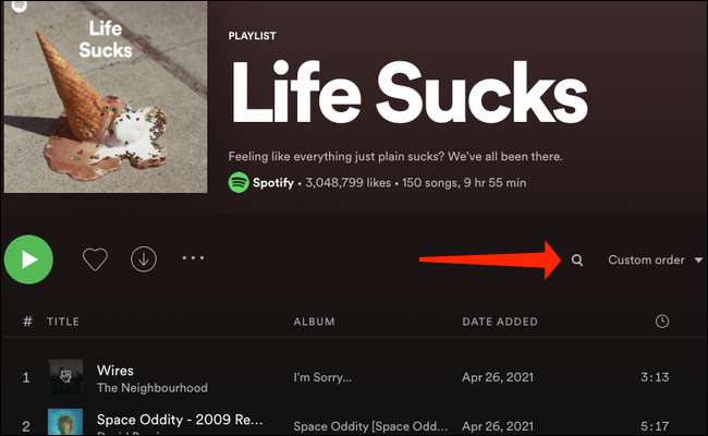 Aplicațiile Spotify pe Windows. și Mac Luați o abordare similară pentru a vă permite să găsiți melodii în cadrul listelor de redare. În primul rând, lansați aplicația, apoi deschideți orice listă de redare în Spotify for Windows sau Mac. Apoi, faceți clic pe pictograma lupă de mai sus prima melodie din lista de redare.