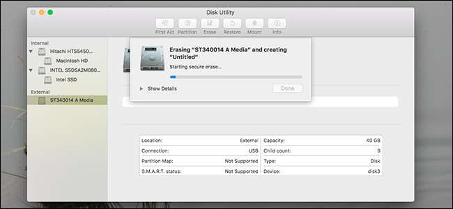 După ce ați ales câte șervețele doriți să rulați, dați clic pe „OK”, apoi dați clic pe „Ștergeți” la solicitarea inițială. Mac-ul dvs. va începe să șteargă unitatea.